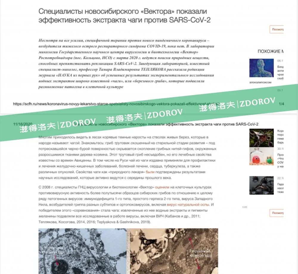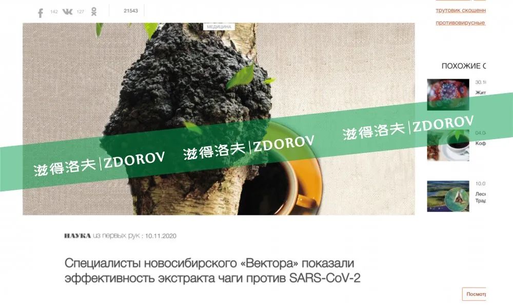 俄罗斯国际病毒和生物技术中心官方网站文章信息显示——“自2020年3月起,俄罗斯国家病毒和生物技术中心的实验室一直在寻找能够阻止新型冠状病毒SARS-CoV-2复制的天然物质。日前该实验室主任,著名的真菌学专家,塔玛拉·弗拉基米罗夫娜·特普里亚科娃教授对《SCIENCE From First Hand》杂志编辑说,实验研究表明,桦褐孔菌(白桦茸,CHAGA)的水提取可成功抑制细胞培养中病原体SARS-CoV-2的繁殖。