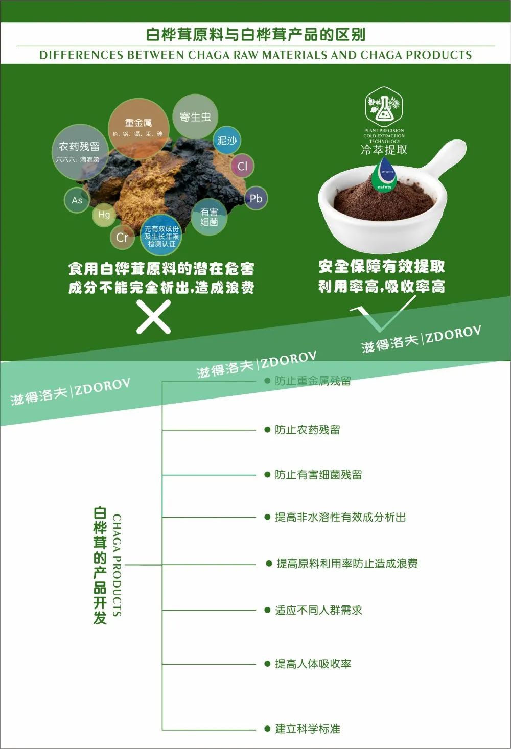 鉴于使用冲泡或者水煮的方式食用白桦茸原料会造成大量非水溶性营养物质无法析出,白桦茸中大量的有效成分中包括:三萜化合物(灵芝酸),白桦酸,黄酮,植物多酚等都是非水溶性物质,而且高温环境下会损伤很多原生活性营养物质,所以,食用白桦茸原料是一种浪费的食用方式。而且目前市场上流通销售的白桦茸原料质量参差不齐,原料本身不经过各种食品安全检验检疫,大部分白桦茸原料存在重金属,农药残留,微生物细菌等污染,存在非常大的食用风险。所以,为了保证食品安全,提高白桦茸非水溶性物质的析出,防止造成浪费,增强人群的针对性与人体吸收率,滋得洛夫率先在国内对白桦茸产品制定出科学标准并实现量产。