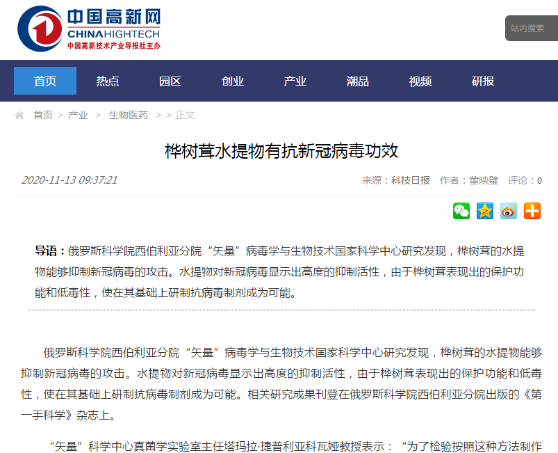 俄罗斯国际病毒和生物技术中心官方网站文章信息显示——“自2020年3月起,俄罗斯国家病毒和生物技术中心的实验室一直在寻找能够阻止新型冠状病毒SARS-CoV-2复制的天然物质。日前该实验室主任,著名的真菌学专家,塔玛拉·弗拉基米罗夫娜·特普里亚科娃教授对《SCIENCE From First Hand》杂志编辑说,实验研究表明,桦褐孔菌(白桦茸,CHAGA)的水提取可成功抑制细胞培养中病原体SARS-CoV-2的繁殖。