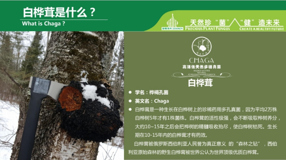 白桦茸(Inonotus Obliquus),俄文名称чага,是一种生于白桦树上的药用真菌,学名叫做桦褐孔菌,其子实体呈炭黑色的块状形态,主要分布于北半球北纬40°--50°即俄罗斯西伯利亚、北欧、日本北海道、中国黑龙江等高寒地带。
