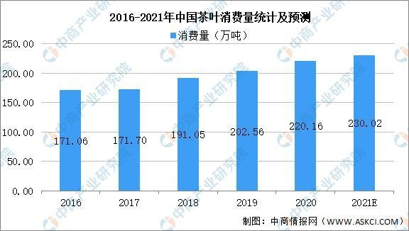覆盖的场景也非常广。近年来,我国茶叶消费量持续增长。根据中国茶叶流通协会统计,2020 年,中国茶叶国内销售量达 220.16 万吨, 比增 17.61 万吨,增幅为 8.69%。中商产业研究院预测,2021 年我国茶叶消费量可达到 223.94 万吨。