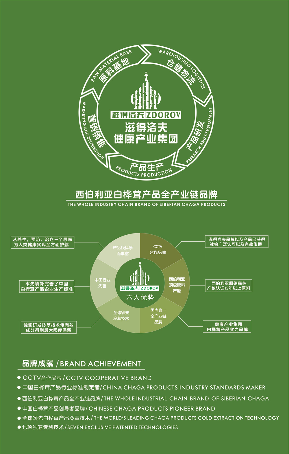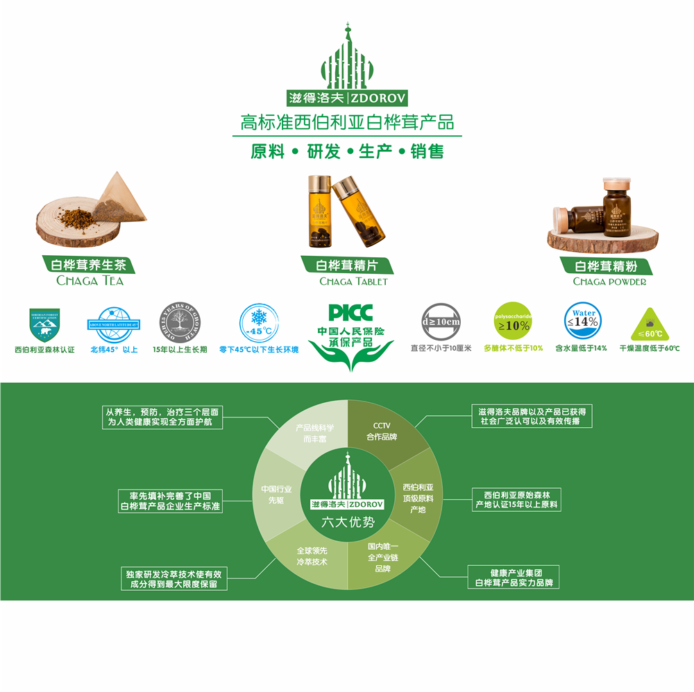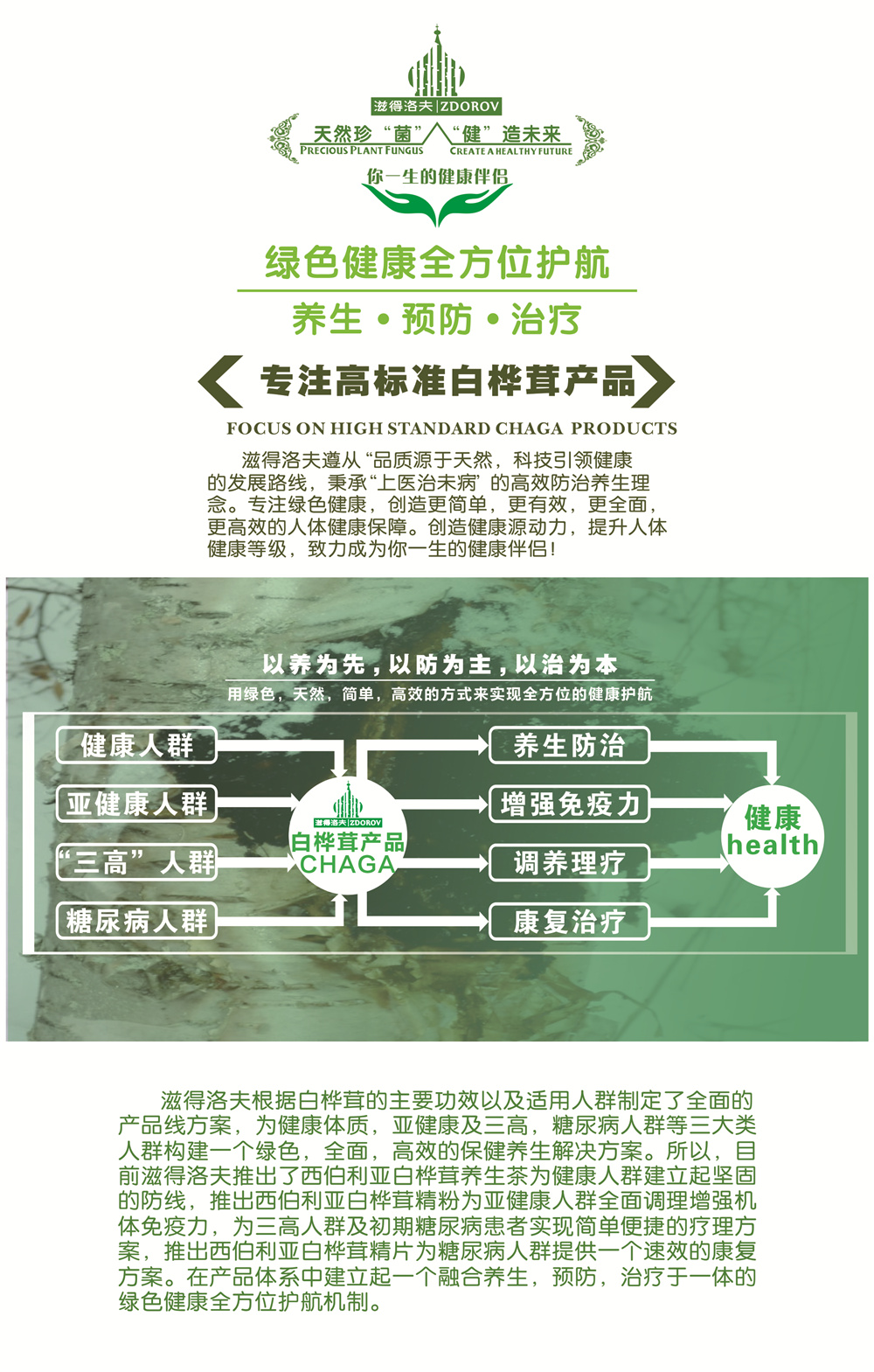 滋得洛夫根据白桦茸的主要功效以及适用人群制定了全面的产品线方案,为健康体质,亚健康及三高,糖尿病人群等三大类人群构建一个绿色,全面,高效的保健养生解决方案。所以,目前滋得洛夫推出了西伯利亚白桦茸养生茶为健康人群建立起坚固的防线,推出西伯利亚白桦茸精粉为亚健康人群全面调理增强机体免疫力,为三高人群及初期糖尿病患者实现简单便捷的疗理方案,推出西伯利亚白桦茸精片为糖尿病人群提供一个速效的康复方案。在产品体系中建立起一个融合养生,预防,治疗于一体的绿色健康全方位护航机制。