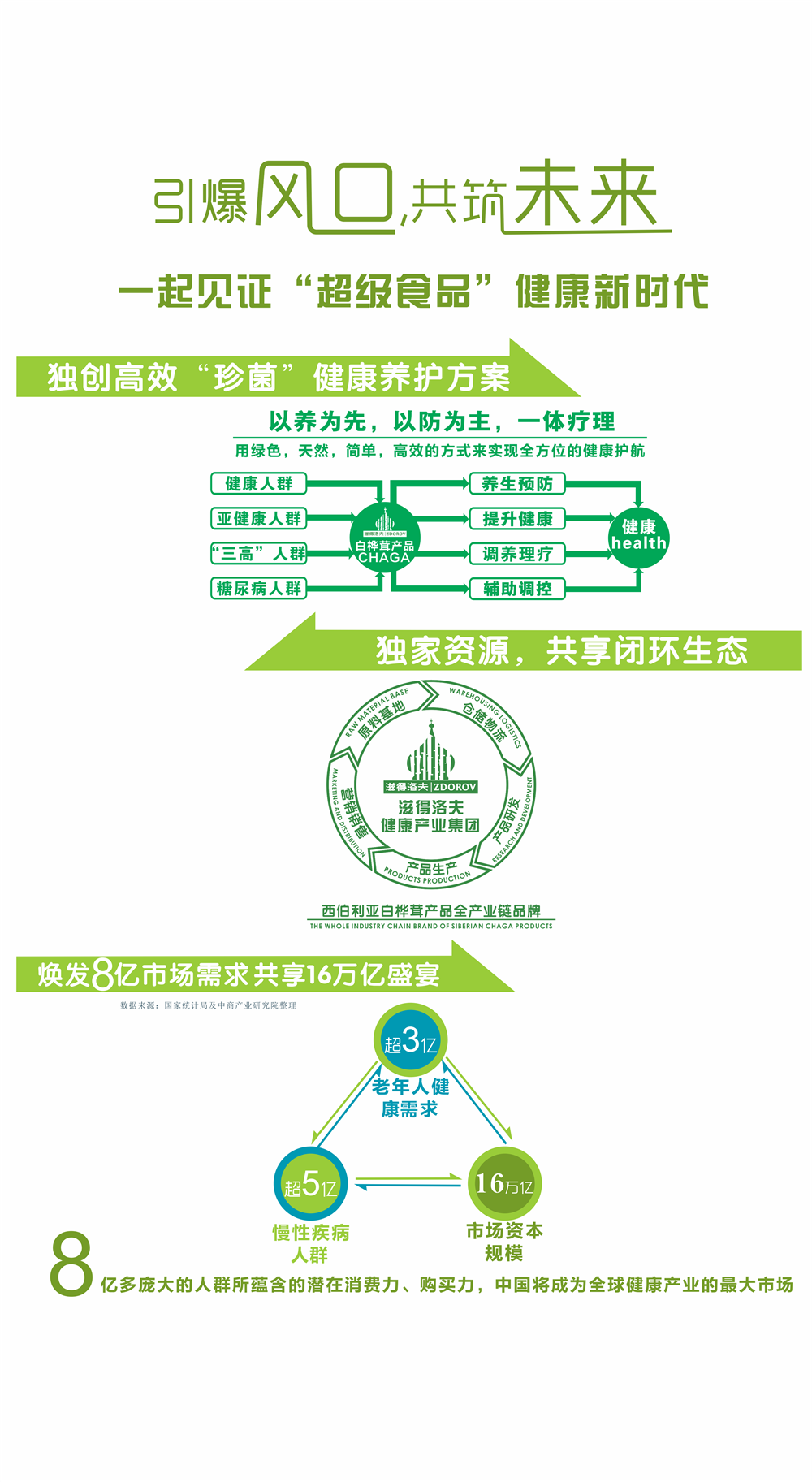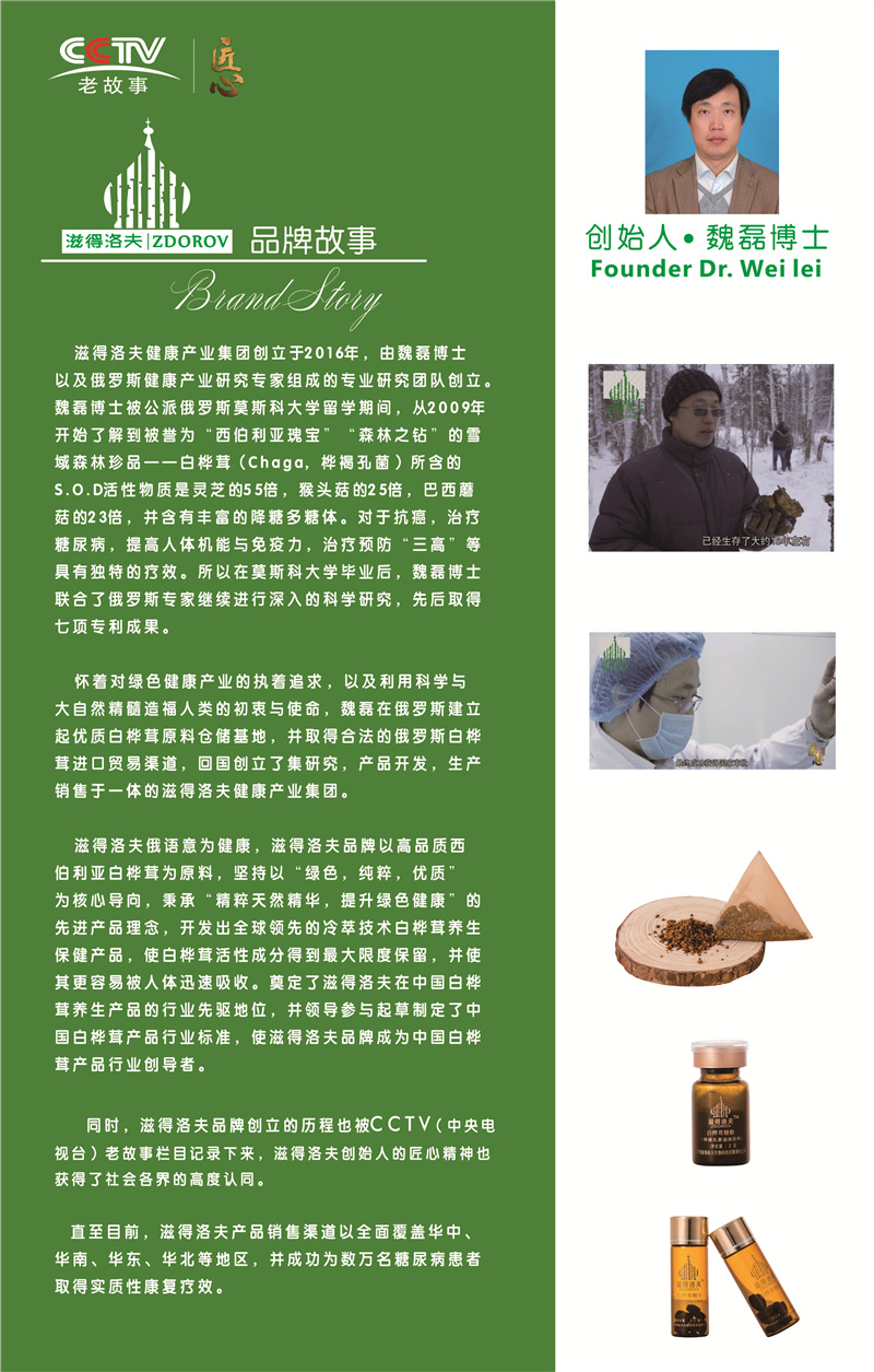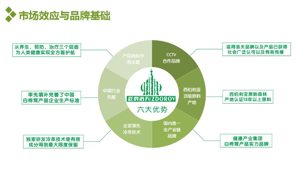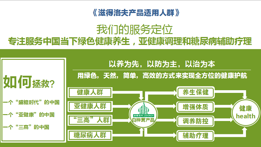 滋得洛夫根据白桦茸的主要功效以及适用人群制定了全面的产品线方案,为健康体质,亚健康及三高,糖尿病人群等三大类人群构建一个绿色,全面,高效的保健养生解决方案。所以,目前滋得洛夫推出了西伯利亚白桦茸养生茶为健康人群建立起坚固的防线,推出西伯利亚白桦茸精粉为亚健康人群全面调理增强机体免疫力,为三高人群及初期糖尿病患者实现简单便捷的疗理方案,推出西伯利亚白桦茸精片为糖尿病人群提供一个速效的康复方案。在产品体系中建立起一个融合养生,预防,治疗于一体的绿色健康全方位护航机制。